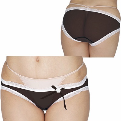 素肌が透けて見える黒の極薄生地を白レースで飾った日本製フルバック。色気たっぷりなシースルー生地のフロントに、白の花飾りをつけたリボンをあしらいフェミニンに仕上げた一枚です♪