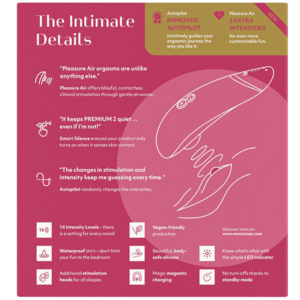 圧倒的な人気を誇るウーマナイザープレミアムが2へバージョンアップした「ウーマナイザー プレミアム2 (ラズベリー)」!強弱12段階から14段階へパワーアップし、従来の吸引バイブに新たに「タッチセンサー機能」と「パイロットコントロール機能」を搭載。