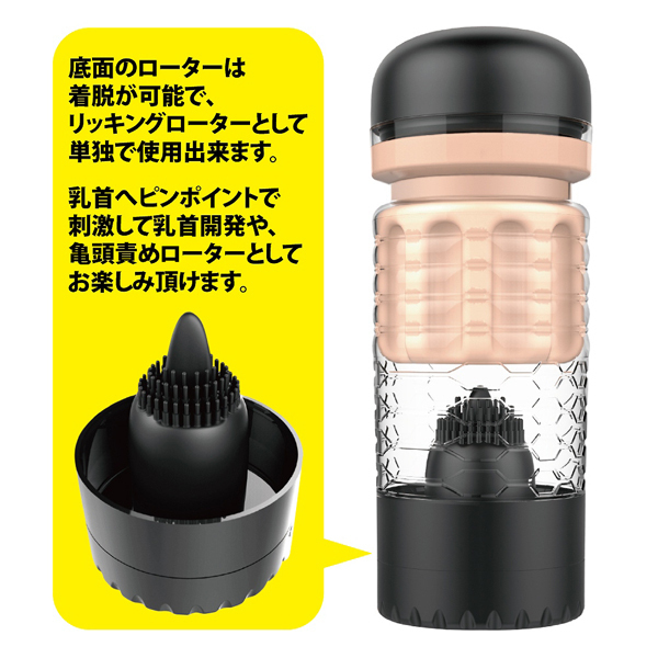 最深部には驚愕の快感刺激が待ち受ける!肉肉しいまでのヴァギナホールの深部には高速でペロペロ舐めてくる舌が♪やわらかくて密着するエラストマー素材を使用し、ビッシリと配置したイボ突起が気持ちいい!オナホとしてはもちろん、分解して取り外した底面のダイヤル式リッキング振動スピードローターは取り外して単体でも使用可能です!振動の強弱調整はダイヤル式、単4電池を3本使用。